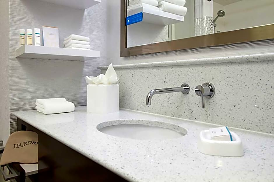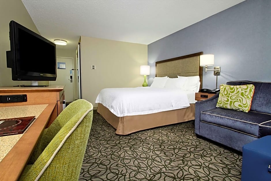 This hearing accessible, non-smoking room features one king-sized bed. The room also has a visual alarm and notification devices for the doorbell or door knock and incoming phone calls. It features our clean and fresh Hampton bed®, comfortable sofabed, microwave, refrigerator, a HDTV, and easy to operate alarm clock/radio. In the bath you will enjoy a WaterPik shower head and curved shower rod. The free WiFi access will help you stay connected while on the road. If you prefer not to work at the desk, you can use the lapdesk instead. You'll also enjoy the convenience of having a coffeemaker with tea service and iron/ironing board in your room. Any corresponding photo may not reflect the specific accessible room type or room feature.